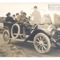 - Foto de Teresa Carreño en un vehículo de la época acompañada por un grupo de personas